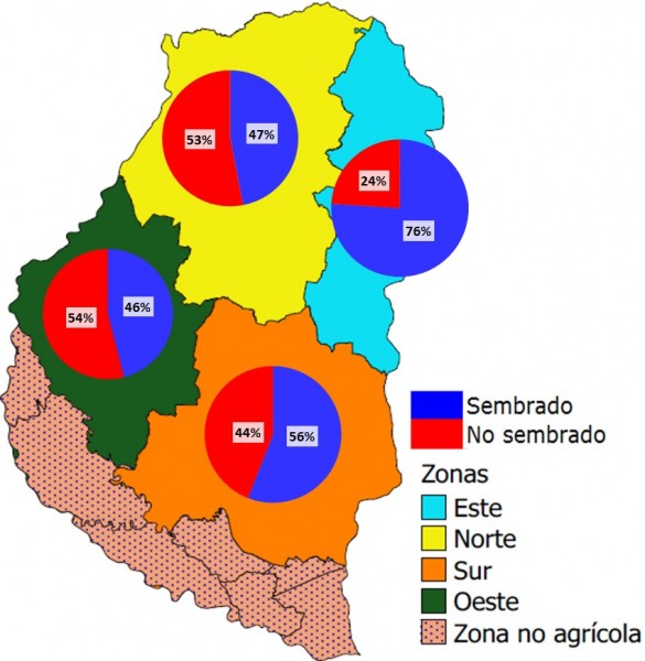 En la Figura 2 se detalla el avance por zona. El mayor avance se registró en el sector Este con el 76 %, pero cabe destacar su participación en la superficie implantada es muy baja. Alrededor de 90 % del área se ubica en el sector Oeste y Sur que cuentan con un avance del 46 y 56 % respectivamente.