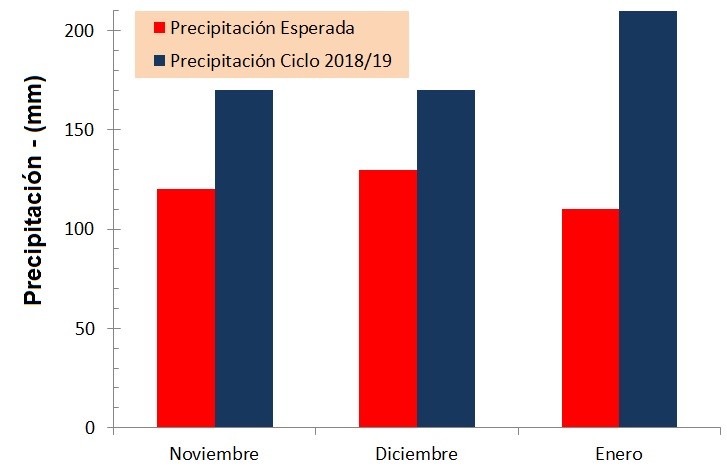 Es muy importante destacar que desde el 01/11/18 al 15/01/19 la provincia de Entre Ríos recibió una precipitación promedio acumulada de 550 mm (Figura 3). Por lo tanto, se registró un incremento del 83 %, es decir que hubo un aporte extra de 250 mm, ya que el valor esperado en estos 76 días es de aproximadamente 300 mm.