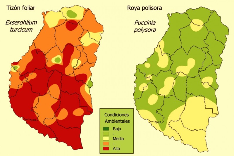 Esta semana se reinicia la publicación de Informes que se refieren a los mapas de riesgo para tizón foliar (Exserohilum turcicum) y roya polisora (Puccinia polysora) y al estado sanitario de los maíces tardíos, trabajo que se realiza en forma conjunta entre el Proyecto SIBER (Bolsa de Cereales de Entre Ríos), la consultora Campo Global y Patología Vegetal de la EEA Paraná de INTA (Ing. Á. Norma Formento).