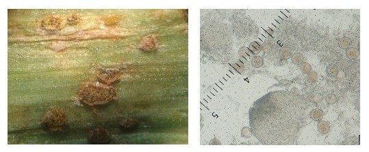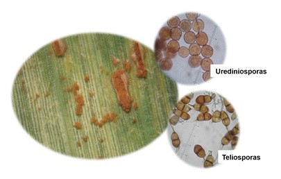 La roya común para infectar al maíz requiere alta humedad relativa, agua libre sobre la hoja, y temperaturas entre 16 y 23°C. Cuando las condiciones climáticas son poco favorables como las actuales para esta enfermedad, la evolución es lenta, de allí que las severidades observadas sean bajas hasta el presente. Se detectó la formación de teliosoros ocasionado por las altas temperaturas y se reduce la cantidad de urediniosporas, las que son las responsables de la diseminación de la enfermedad (Fig. 3).