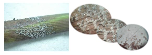 Por otro lado, se detecta en la base de los tallos, formaciones grisáceas que corresponden a un myxomycete, que no causan daño y sin ninguna importancia epidemiológica, ya que ocurre por los excesos hídricos (Fig. 6).