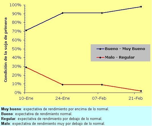En la Figura 1 se muestra la evolución de la condición de la soja de primera desde inicios de enero. Cabe destacar que en las últimas dos semanas se detectó un incremento del 7 % en la condición de bueno a muy bueno.