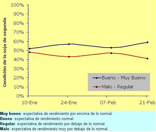 En la Figura 2 se muestra la evolución de la condición de la soja de segunda desde inicios de enero. Al igual que la soja de primera se detecta un incremento en la condición de bueno a muy bueno, en este caso del 6 %.