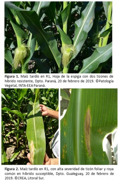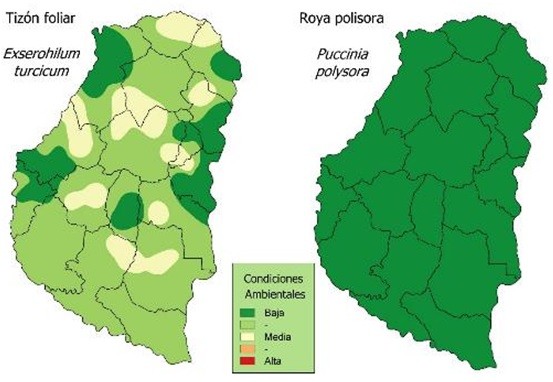 El proyecto SIBER (Bolsa de Cereales de Entre Ríos), la consultora Campo Global y Patología Vegetal de la EEA Paraná de INTA (Ing. Á. Norma Formento) presentan los mapas de riesgo para tizón foliar (Exserohilum turcicum) y roya polisora (Puccinia polysora).