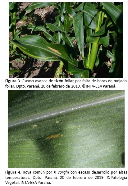 En el Dpto. Paraná y Diamante, el tizón foliar se encuentra restringido al estrato inferior debido a pocas horas de “mojado foliar” por rocío y, a la falta de lluvias. Se observa un retraso en la aparición de nuevos síntomas o la expansión de las lesiones existentes (Figura 3). En relación a la roya común (Puccinia sorghi), las pústulas son escasas, con halo clorótico y poca esporulación debido a las altas temperaturas; avance bajo o nulo (Figura 4), contrariamente a lo observado en el Dpto. Gualeguay. En Mansilla (Dpto. Tala) se aplicó para roya común en V8, en híbridos susceptibles (com. pers., Silvio Spairani).