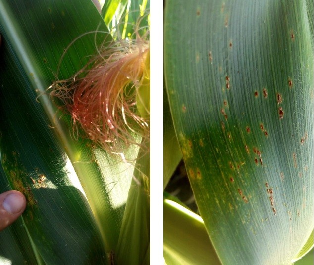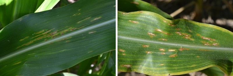 En el Dpto. Victoria, en R1 se registraron niveles altos de roya común (Puccinia sorghi) activa, esporulante de color marrón rojiza posiblemente por temperaturas más bajas con formación de rocío que permanece por muchas horas (Figura 2).