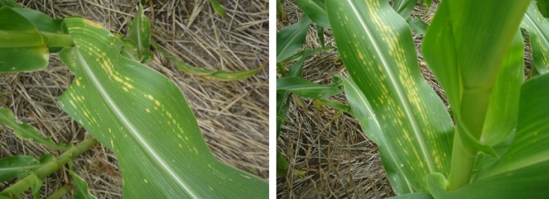 En el Dpto. Victoria, en R1 se registraron niveles altos de roya común (Puccinia sorghi) activa, esporulante de color marrón rojiza posiblemente por temperaturas más bajas con formación de rocío que permanece por muchas horas (Figura 2).