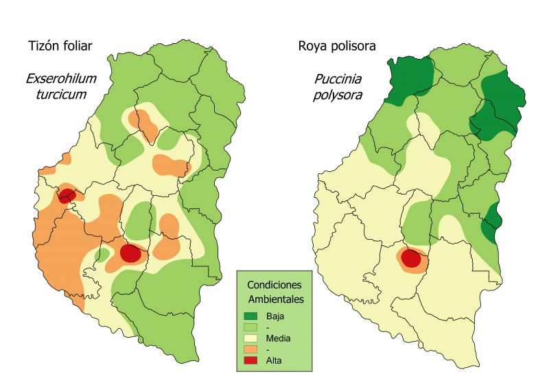 El proyecto SIBER (Bolsa de Cereales de Entre Ríos), la consultora Campo Global y Patología Vegetal de la EEA Paraná de INTA (Ing. Á. Norma Formento) presentan los mapas de riesgo para tizón foliar (Exserohilum turcicum) y roya polisora (Puccinia polysora).
