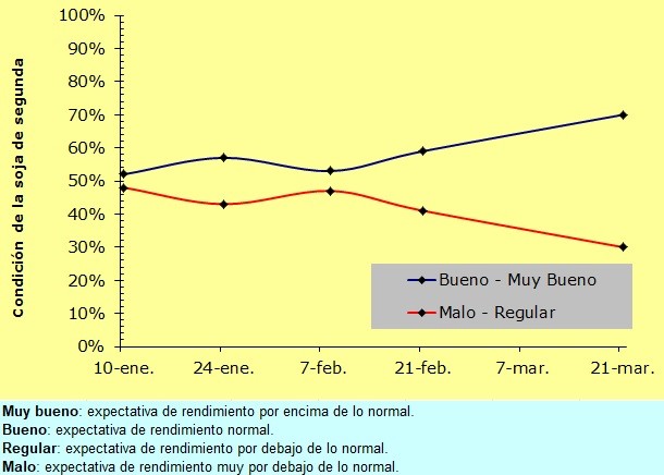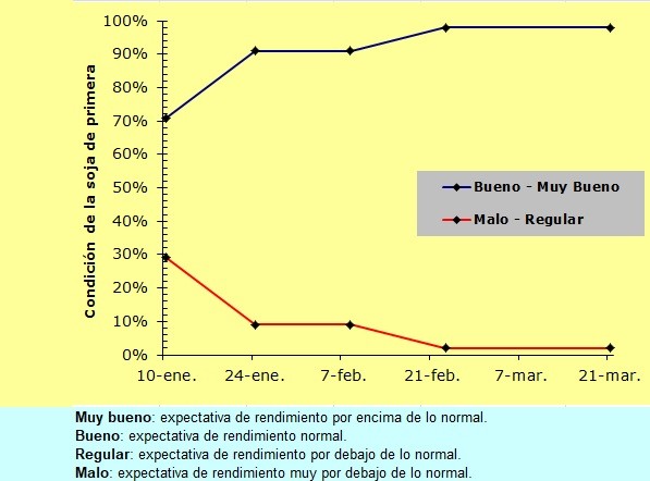 La Figura 1 muestra la evolución de la condición de la soja. Se puede observar que las categorías buena a muy buena se han mantenido estables, por lo tanto existen buenas expectativas de rendimiento.