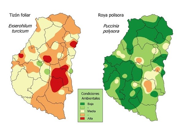 El proyecto SIBER (Bolsa de Cereales de Entre Ríos), la consultora Campo Global y Patología Vegetal de la EEA Paraná de INTA (Ing. Á. Norma Formento) presentan los mapas de riesgo para tizón foliar (Exserohilum turcicum) y roya polisora (Puccinia polysora).