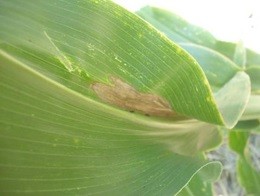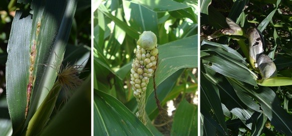 Las enfermedades presentes con niveles leves o moderados según los genotipos y regiones de Entre Ríos son tizón foliar (Figura 2) que continúa en avance sostenido, mancha ocular (Kabatiella zeae), esta última enfermedad de menor importancia, fácilmente visible en condiciones de campo (Figura 3), mancha violeta en las vainas (Figura 4) asociada a la acumulación de agua, anteras caídas y Fusarium spp., diversas bacteriosis en hojas (Figura 5) y carbón del maíz en hojas y espiga (Ustilago maydis) (Figura 6).
