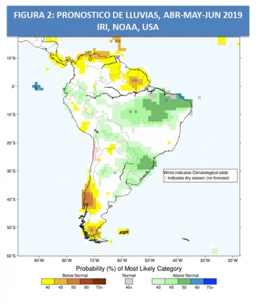Hasta fin de la primera quincena de abril las lluvias se ubicarían por debajo de sus valores normales, y el modelo climático del IRI (NOAA-USA) (ver la FIGURA 2) muestra que para el TRIMESTRE ABRIL – MAYO – JUNIO las lluvias tendrían apartamientos por encima de los valores normales en el norte de Argentina, sur de Brasil, Bolivia y Paraguay, con normalidad en el resto de Argentina, PARTICULARMENTE EN LA PROVINCIA DE ENTRE RIOS donde pueden darse episodios de pulsos frios y efectos de lluvias convectivas.