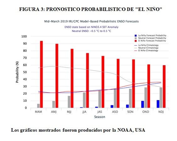 La FIGURA 3 muestra la probabilidad de existencia de Niño, Niña o neutralidad para los trimestres hasta el fin del corriente año y las barras rojas (probabilidad de Niño) señalan que ES MÁS PROBABLE LA CONTINUIDAD DEL EVENTO EL NIÑO HASTA EL TRIMESTRE NOVIEMBRE – DICIEMBRE – ENERO 2020. Si este escenario se cumple, es UNA BUENA NOTICIA para la producción agrícola fina-gruesa de la PROVINCIA DE ENTRE RIOS, y obviamente iremos siguiendo las transformaciones en el Pacífico Ecuatorial Central, donde se desarrolla el fenómeno «EL NIÑO».