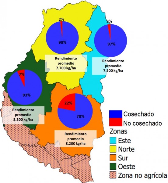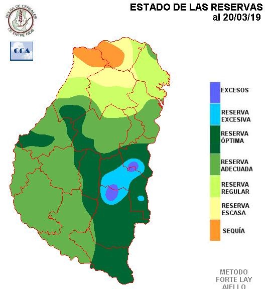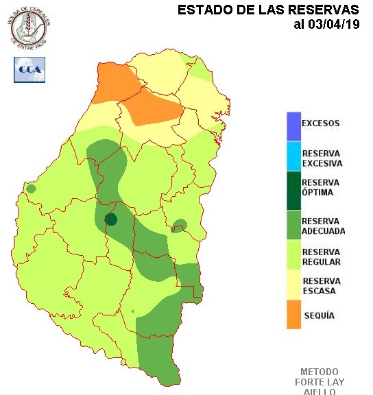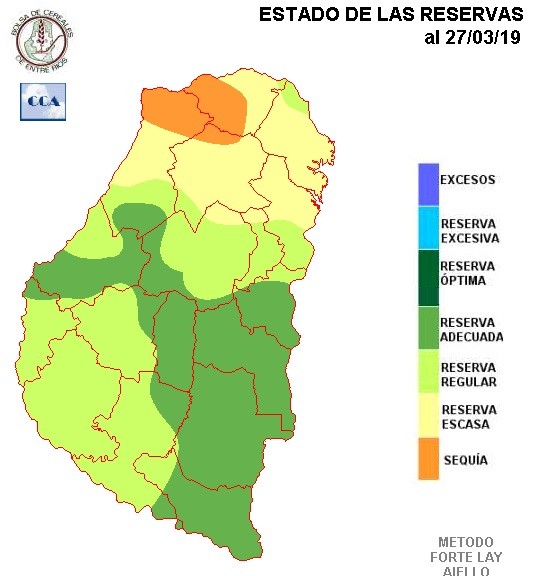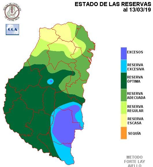 De acuerdo a esta distribución temporal de las precipitaciones, es lógico encontrarse con un balance hídrico en retroceso, mejor dicho, con un área de reservas adecuadas en disminución, dado que en general no puede decirse que el nivel de reservas es desfavorable. Los suelos y los caminos rurales, en general, presentan un estado favorable para las tareas de recolección.