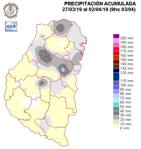 Dentro de este contexto ambiental de verano que se viene imponiendo en la transición intermensual, las lluvias que se observaron en los últimos días de marzo y los primeros de abril, fueron de carácter convectivo, predominando en zonas que se ubican del centro para el norte de la provincia. Desde el sudeste de La Paz hacia San Salvador y Concordia aparece una zona con acumulados más homogéneos, observándose también este comportamiento en Feliciano. En el resto del territorio las lluvias fueron modestas o nulas, con algunas excepciones de escala reducida como en el norte de Rosario del Tala.