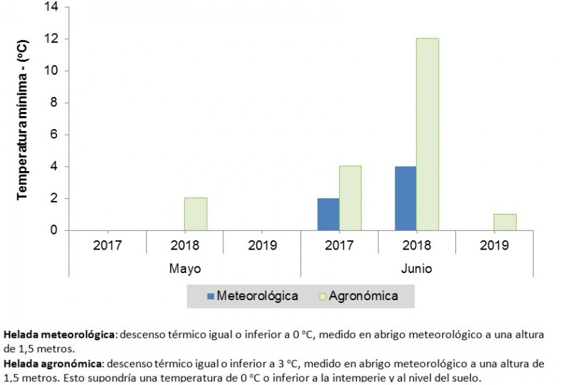 Por otra parte, la cantidad de heladas agronómicas, el año 2019 tuvo solamente una, mientras que en el 2018 hubo catorce y en el 2017 cuatro.