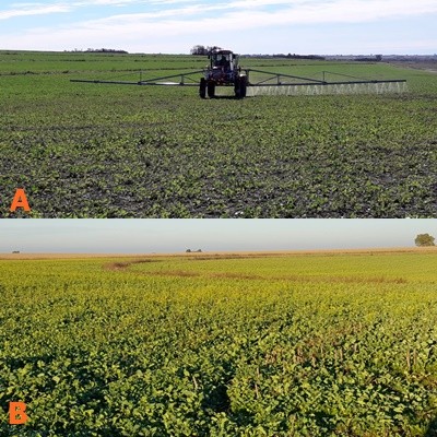 En la Figura 3 se puede observar un lote en estado de roseta donde se está aplicando fertilizante líquido y otro de fecha de siembra temprano con plantas en floración, ambos en departamento Victoria.