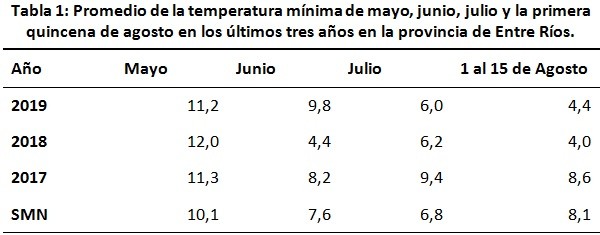 En la Tabla 1 se muestra el promedio de la temperatura mínima de la red de centrales automáticas y el promedio histórico para Entre Ríos que brinda el Servicio Meteorológico Nacional (SMN). Los datos del SMN fueron descargados del sitio web www.smn.gob.ar.