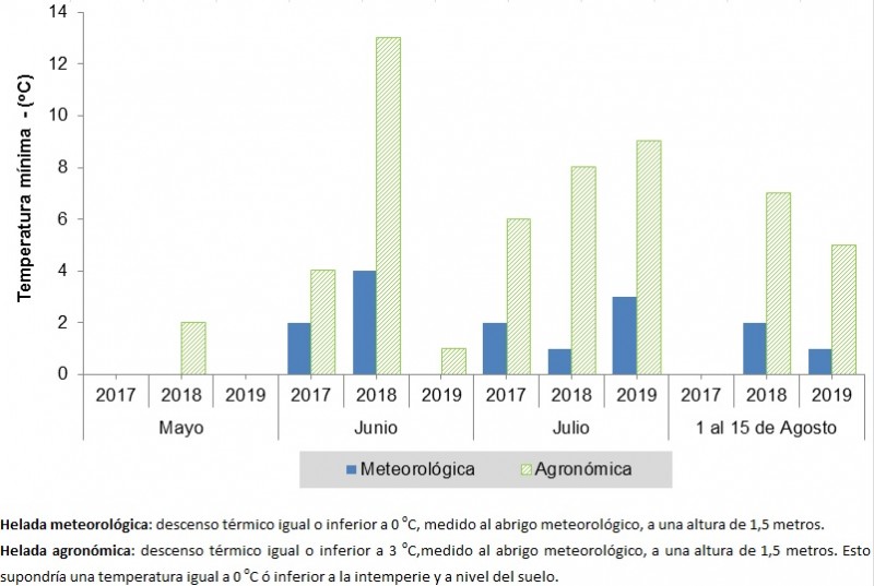 En relación a la cantidad de heladas meteorológicas desde el 01/05 al 15/08 en el 2018 fueron un total de siete y en el 2019 y 2017 el valor fue de cuatro.
