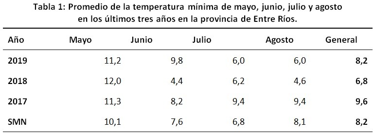En la Tabla 1 se muestra el promedio de la temperatura mínima de la red de centrales automáticas y el promedio histórico para Entre Ríos que brinda el Servicio Meteorológico Nacional (SMN). Los datos del SMN fueron descargados del sitio web www.smn.gob.ar.