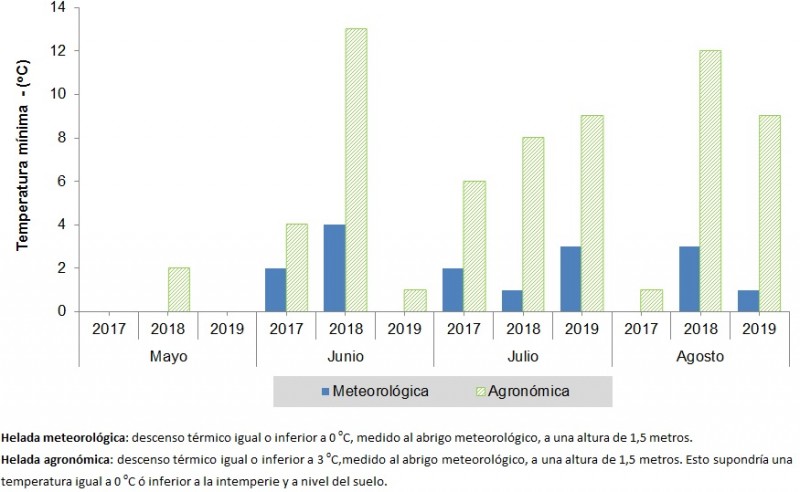 En relación a la cantidad de heladas meteorológicas desde el 01/05 al 13/08 en el 2018 fueron un total de ocho y en el 2019 y 2017 el valor fue de cuatro.