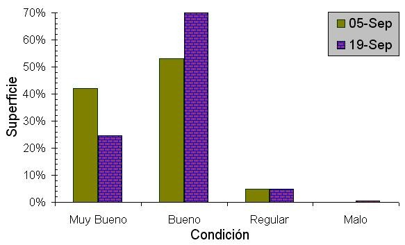 En base a consultas efectuadas a la red de colaboradores se evaluó la condición general del cultivo. El resultado del análisis refleja que el 94,5 % del área se encuentra en una condición de buena a buena. Esta valor es similar a lo registrado a inicios del mes de septiembre (95 %), no obstante hubo cambios importantes en la categoría muy buena que experimentó un descenso de 17,5 % (Figura 2).
