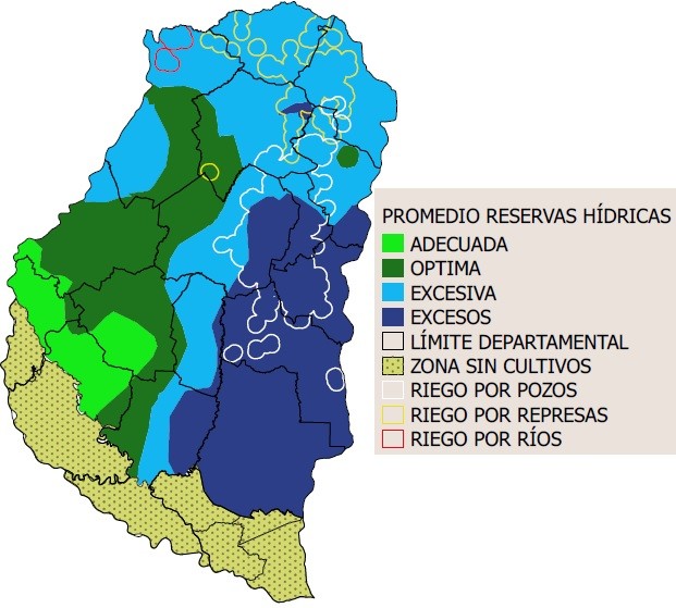 El balance hídrico mostraba a las 9hs de ayer una importante zona de exceso hídrico sobre centro este provincial y zonas del departamento La Paz, coincidiendo con las áreas donde las precipitaciones fueron recurrentes y alcanzaron mayor volumen. A medida que nos desplazamos hacia el sur las reservas se ajustan, acordando con la oferta de agua más escasa que hemos analizado en el párrafo anterior.