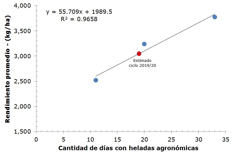 En base a los datos aportados por la red de centrales meteorológicas automáticas se efectuó una proyección del rendimiento promedio esperado a nivel provincial para la campaña 2019/20 en función de la cantidad de días con heladas agronómicas. Cabe recordar que la helada agronómica se presenta con temperaturas inferiores a 3 oC al abrigo meteorológico, a una altura de 1,5 metros, lo cual supone una temperatura equivalente a 0 oC a nivel del suelo.