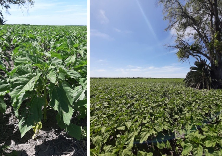 El estado fenológico del girasol se ubica de V4 (cuatro hojas desarrolladas) a V8 (ocho hojas desarrolladas), ver Figura 3. No se reportan problemas por ataques de insectos o enfermedades.