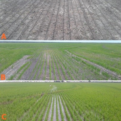 En la Figura 1 se muestra los últimos lotes sembrados donde se observa las distintas situaciones en el cultivo, siembra, emergencia, macollaje y los primeros lotes inundados.