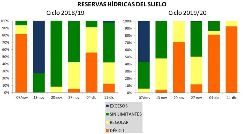 En la Figura 4 se puede apreciar la evolución de las reservas hídricas en la provincia de Entre Ríos del 01/Nov al 11/Dic para el ciclo 2018/19 y 2019/20. Es importante mencionar que en estos 41 días, el ciclo 2018/19 tuvo una situación promedio de déficit hídrico que abarcó del 26 % del área agrícola de la provincia y actualmente este valor se posiciona en el 43 %.