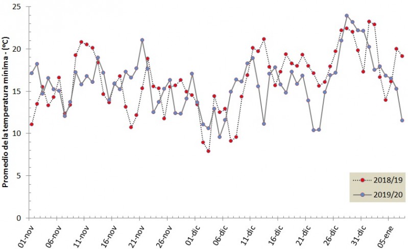 En la Figura 2 se muestra el comportamiento de la temperatura mínima del 01/Nov al 07/Ene para el ciclo 2018/19 y 2019/20 en la provincia de Entre Ríos. Los datos fueron obtenidos del promedio de la red de centrales meteorológicas automáticas de la Bolsa de Cereales de Entre Ríos.
