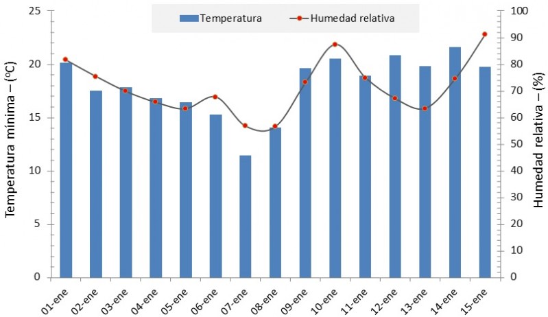 Claramente se observa que a partir del miércoles 8 de enero se registró un incremento de los valores de la temperatura y humedad relativa, los cuales generaron un ambiente más propicio para el desarrollo del insecto.