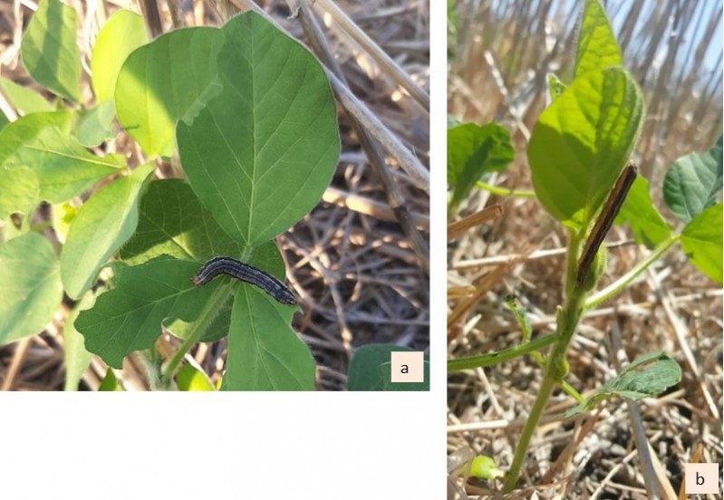 Los colaboradores reportan que en los últimos días se observó daños ocasionados por la “oruga militar” fundamentalmente en lotes sembrados con soja de segunda (Figura 3 a y b).