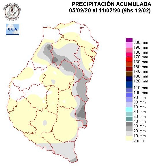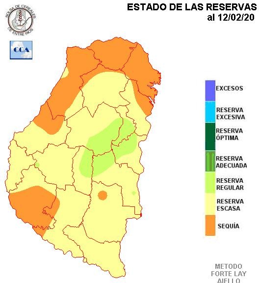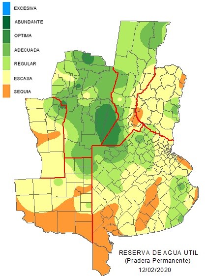 El mapa que presentamos en este breve informe muestra las reservas de agua útil en Entre Ríos y el resto de la región pampa húmeda al 12/Feb/2020.