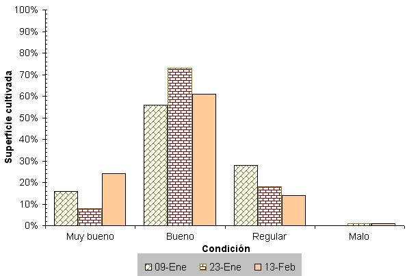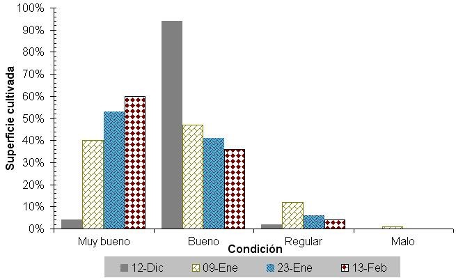 La Figura 2 muestra la evolución de la condición de la soja de segunda desde el 09/Ene al 13/Feb. Se destaca el hecho del incremento de la condición muy buena en 16 puntos porcentuales.