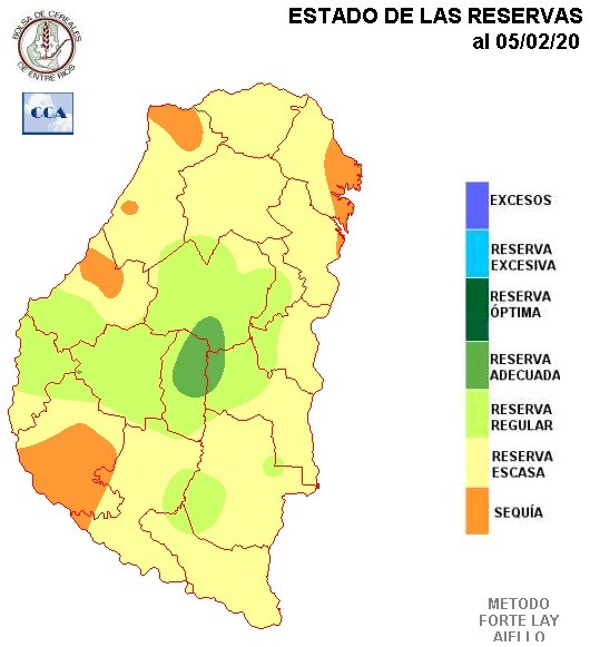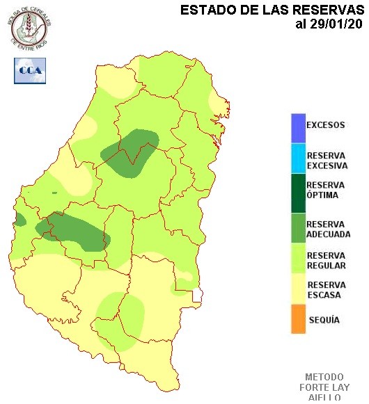 Por otra parte, el hecho de que el 85 % del área posea una condición de buena a muy buena está sujeta a la ocurrencia de precipitación en los próximos días. Tal como se observa en el mapa de reservas hídricas, la provincia está en una situación de reservas escasas, escenario que puede transformarse en una situación de sequía, de no mediar lluvias en la próxima semana.