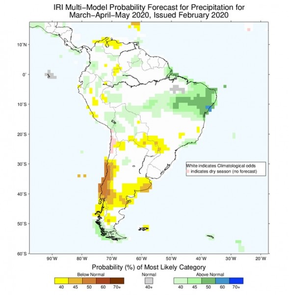 La respuesta más significativa es que durante el trimestre en curso hubo un paulatino aumento de la temperatura superficial del Océano Pacífico, o sea que se ha insinuado un Niño de muy baja intensidad, y eso es favorable para el aporte de flujos de humedad desde el norte (Brasil) que hasta el centro de la Provincia de Buenos Aires favorecerían los montos de lluvias. Por otra parte son adecuados los indicadores del Atlántico y la dinámica de frentes es normal, por lo tanto el escenario que aparece como más probable es el de lluvias normales para el trimestre marzo-abril-mayo. Observando el mapa, las áreas con menores aportes de lluvias quedarían confinadas en el sudeste de la Provincia de Buenos Aires.