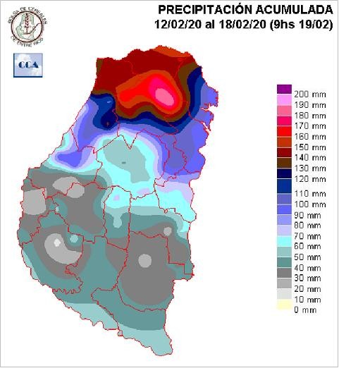 En gran parte del territorio entrerriano, las pobres precipitaciones de los últimos diez días de enero, se mantuvieron durante en los primeros diez días de febrero. Recién durante la última semana, las lluvias regresaron con buena cobertura y volumen, aunque con un despliegue sustancialmente más generoso sobre los departamentos del norte.