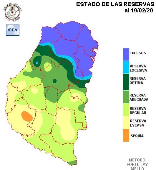 Conforme nos desplazamos hacia el sur de la provincia, la condición que presentan las reservas de humedad se va deteriorando, observándose un predominio de la categoría regular sobre la mayor parte del sur de la provincia. No podemos descartar que el bolsón más seco que se insinúa sobre Victoria, no gane territorio durante el resto de febrero.