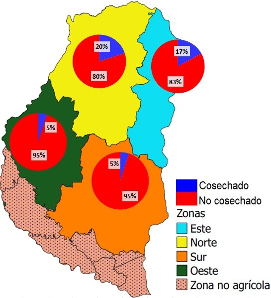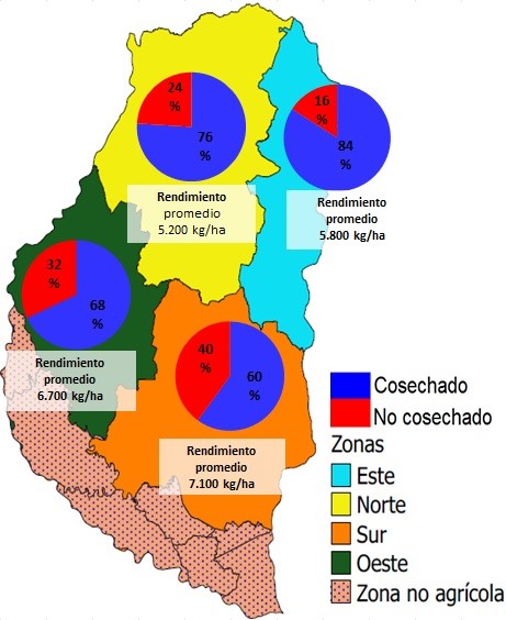 En la Figura 1 se observa el avance de cosecha y rendimiento promedio en las difentes zonas de la provincia.