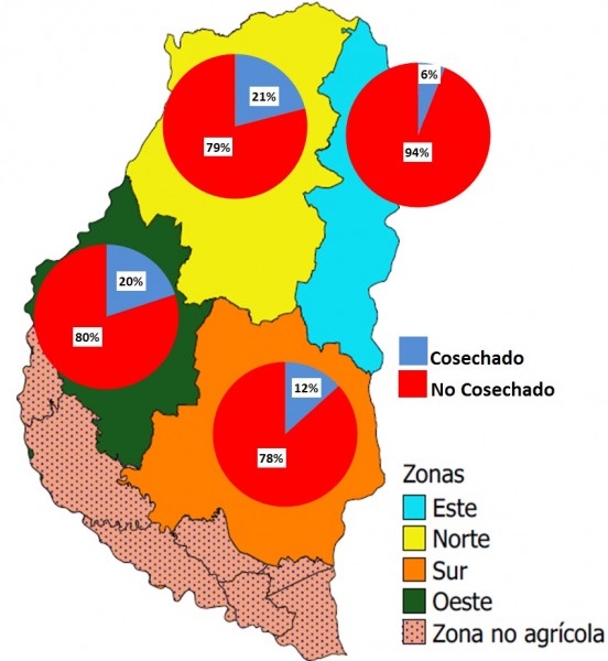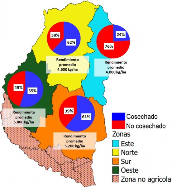 A nivel provincial se cosechó el 57 % del área total, con un rendimiento promedio que se sitúa en 5.100 kg/ha. En la Figura 4 se muestra el grado de avance y el rendimiento promedio por zonas.