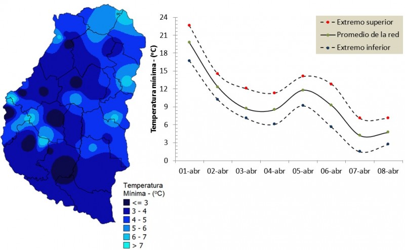 En la Figura 1 se puede observar la distribución de las temperaturas mínimas para el martes 7 de abril, donde se observan sectores con heladas agronómicas.