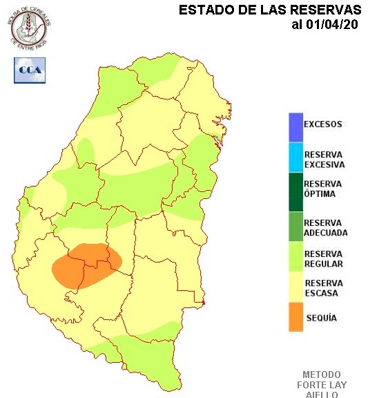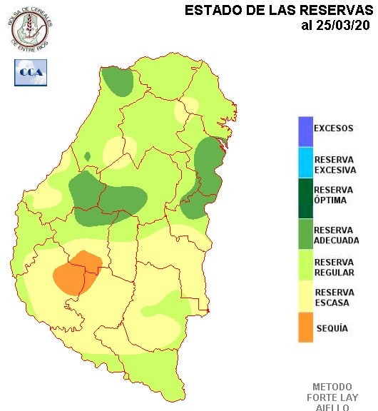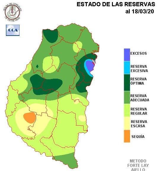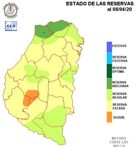 Las reservas de humedad no logran reaccionar con los escasos aportes pluviales que se vienen observando. Si bien las coberturas no consumen y las exigencias atmosféricas son bajas, el arrastre deficitario tiene mucho peso en el balance. Está claro que en otro momento el área de seguía que se observa en el sur de Nogoyá y las vecindades de Victoria y Gualeguay, seguramente hubiese crecido más rápido, lo cual no quita que la demanda de precipitaciones es importante aún en suelos donde las reservas se mantienen por encima del nivel de sequía.