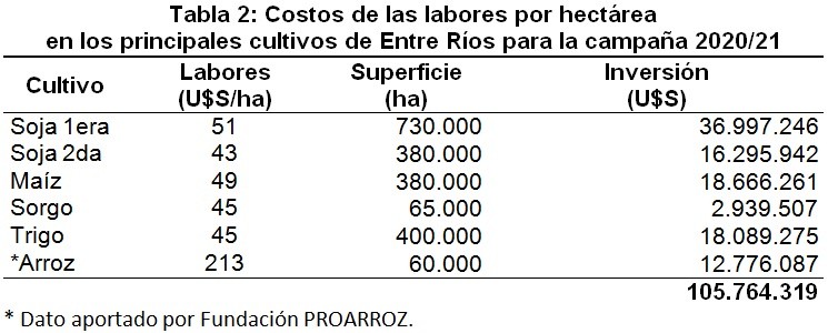 Para el caso del arroz se tuvo en cuenta un promedio de acuerdo al tipo de riego sea de poso o represa a gasoil o eléctrico, obtenido a partir de los datos económicos publicados por la Fundación PROARROZ.