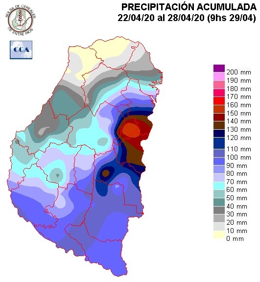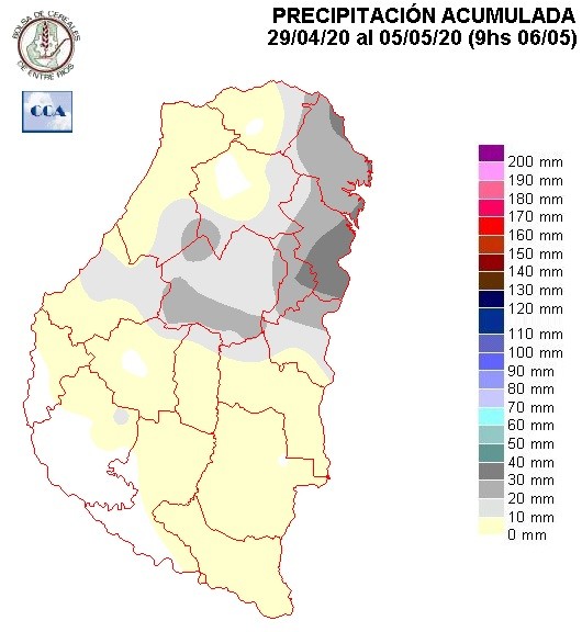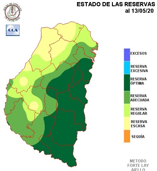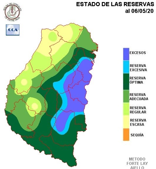 De acuerdo a la previsto entre el miércoles 13 y el martes 19 no se observaron precipitaciones. La inestabilidad acompañada de algunas lluvias sobre el noreste de la provincia, comenzó a llegar durante la tarde noche de ayer. Las mismas se generalizaron amaneciendo para hoy en gran parte del territorio entrerriano, mostrando acumulados modestos, salvo algún chaparrón puntual más generoso. El mapa de balance hídrico mantiene la configuración que se presentaba la semana pasada, ya sin excesos sobre el este, resultando en general adecuadas las reservas pero con una reducción de las zonas donde la humedad se presenta sobrada. Sobre el centro oeste, la disponibilidad de humedad se presenta más ajustada. Esto ya lo hemos comentado, la recuperación de finales de abril en la zona fue muy oportuna, pero no todo lo abundante que hubiese sido necesaria. Las lluvias que se han registrado por estas horas no son demasiado auspiciosas. Si bien hubo algunos registros en los departamentos del sudoeste que han sumado hasta quince milímetros, los mismos no han sido generalizados. El ambiente todavía esta susceptible para el desarrollo de tormentas, pero la realidad marca que la probabilidad de que las mismas se concreten es más elevada del centro para el norte provincial. Habrá que ver entonces cuando cierre el día viernes cual es el saldo pluvial de este pasaje frontal, tras el cual se espera un marcado descenso térmico. El cambio de ambiente se sostendrá durante el fin de semana, pero las máximas volverán a repuntar, incluso ya desde el día domingo. Entendemos que estas lluvias sin ser demasiado generosas, dejaran lotes con mejor humedad superficial. El análisis se vuelve más específico a nivel de lote, pero las siembras de la fina están en condiciones de iniciarse, quizá con alguna estrategia agronómica que permita conservar humedad.