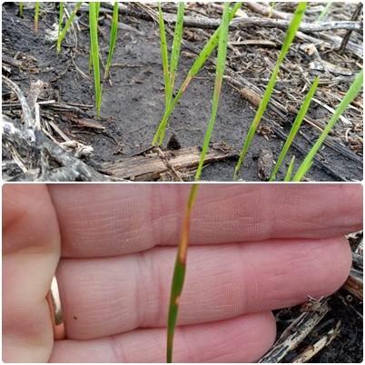 Cabe mencionar que en algunos sitios se observó daños en las hojas ocasionado por heladas. La Figura 3 muestra síntomas de clorosis en plantulas en la etapa de emergencia.