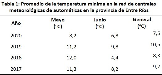 En base a información obtenida de la red de centrales meteorológicas automáticas de la Bolsa de Cereales de Entre Ríos se analizó el comportamiento de la temperatura mínima en los meses de mayo y junio en los últimos cuatro años.