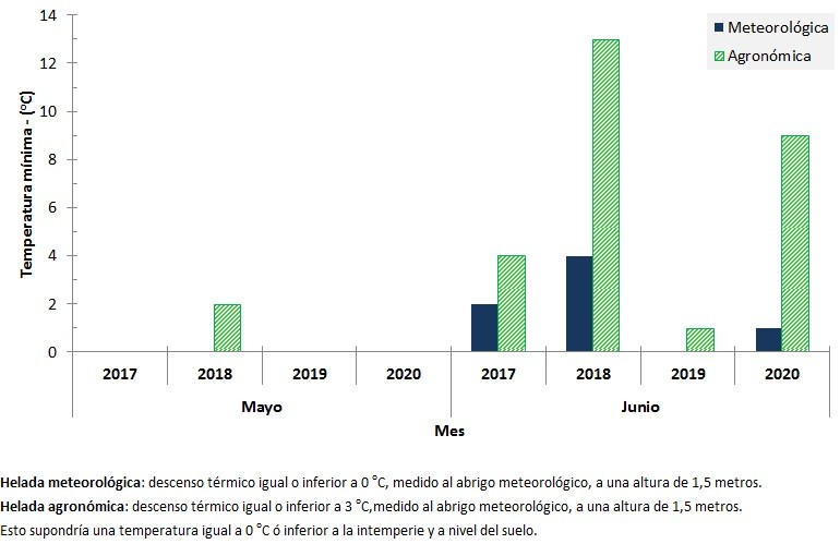 En la Figura 1 se muestra la cantidad de heladas meteorológicas y agronómicas en base al promedio de la temperatura mínima de la red de centrales meteorológicas. El año 2020 entre mayo y junio hubo un total de 1 helada meteorológica y 9 agronómicas.