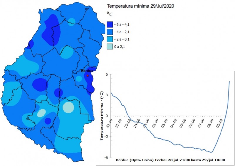Finalmente, se detalla el comportamiento del descenso térmico para la localidad de Berduc (Dpto. Colón) donde la mínima llegó a -5,5 oC y la helada meteorológica duró 10 horas.